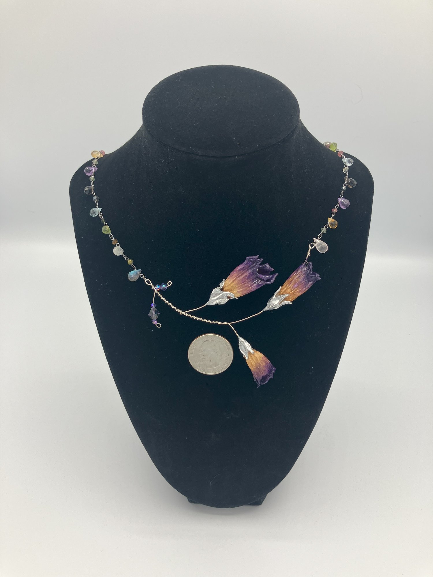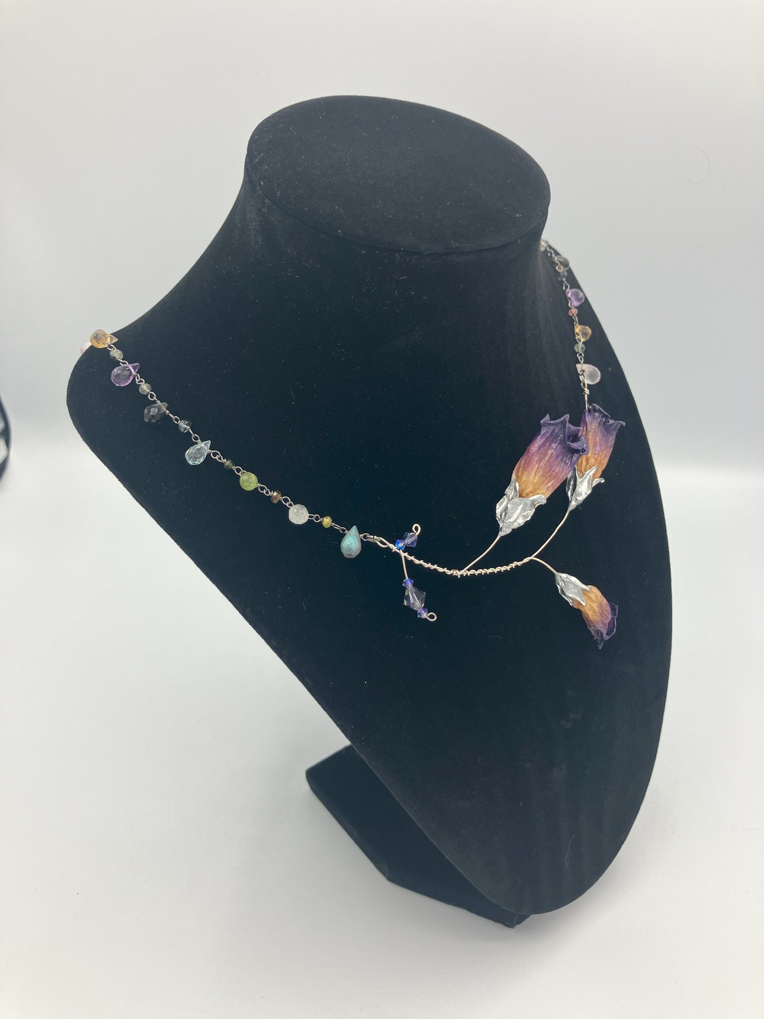 This necklace features a dark purple 3 blossom sprig of REAL deadly nightshade with a tanzanite Swarovski crystal adorned stem. The chain sterling silver with multi gemstone briolette beads. Gemstones include amethyst, labrodorite, topaz, peridot, citrine, and quartz.