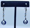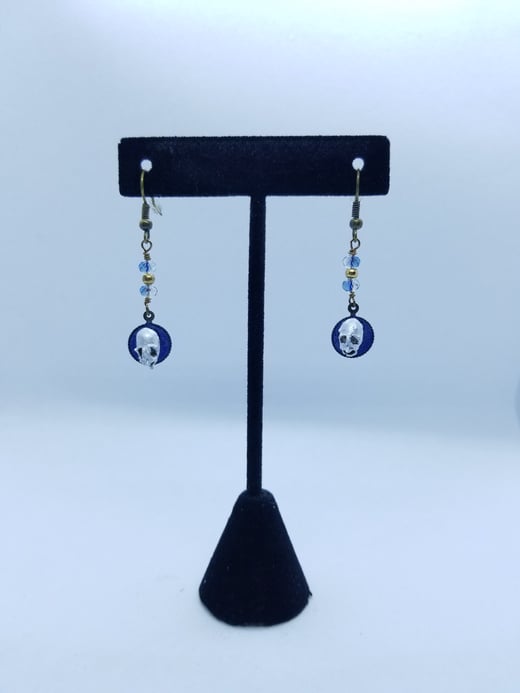 Dangling antique gold tone earrings featuring fairy skulls mounted on a sparkling blue enamel back with blue crystal accents. All fairy shrunken heads and skulls are humanly harvested from snapdragon seedpods. Due to the unique aspects inherent to each individual flower earrings may not be exactly identical.