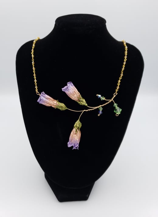The only metallic elements in this piece are the stems and chain. The petals and the sepal leaves have been meticulously preserved, painted, and sealed, so everything you are seeing is the wicked flower itself. This process also ensures that the flower is safe to wear and handle.