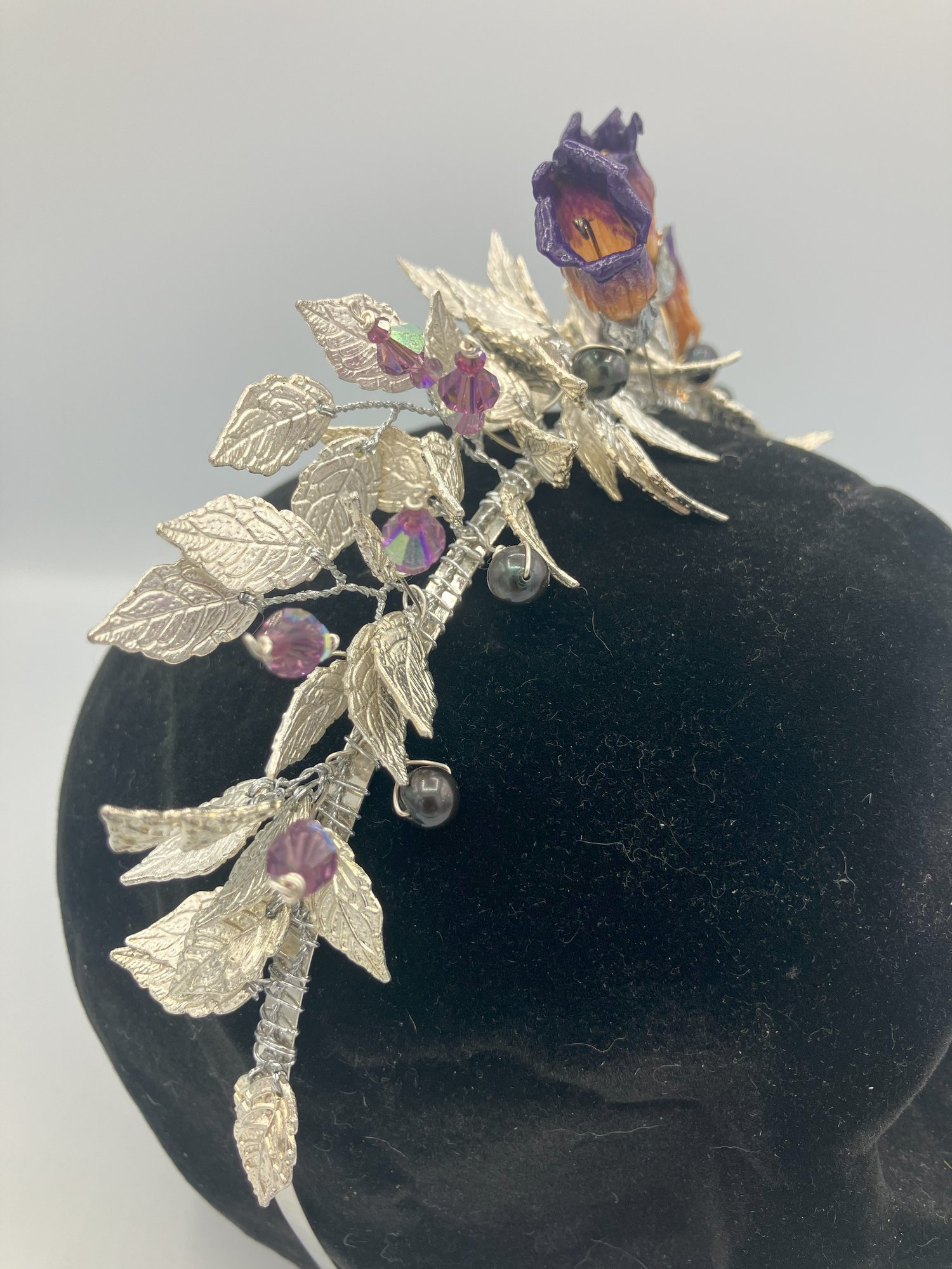 This crown features four REAL preserved dark purple deadly nightshade flowers nestled amid silver tone leaves with amethyst Swarovski crystal accents. The flowers are realistically painted and mounted to appear as if they are blooming on a branch. Black crystal pearls are used to represent the sumptuous poisonous berries.