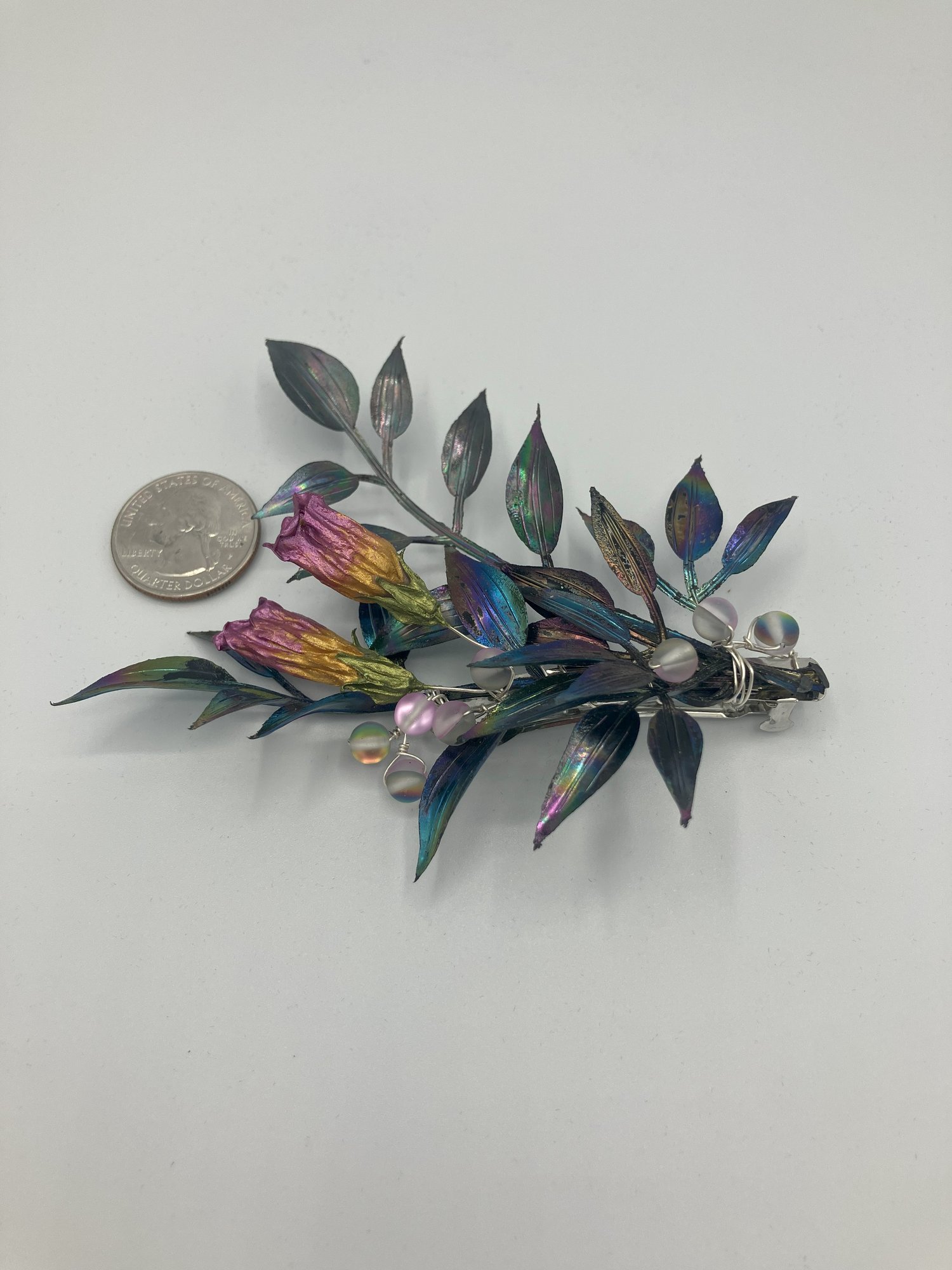 This hair clip features two REAL preserved deadly nightshade flowers nestled amid irridescent black leaves with light purple mermaid glass beads to represent the sumptuous poisonous berries. The flowers are painted a with metallic violet and gold giving them a dramatic impact.